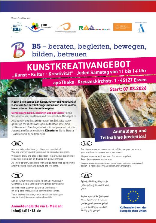 Die KD11-13 gGmbH ist Projektpartner des Projektes „B5 – beraten, bilden, bewegen, begleiten, betreuen“ der Fördergesellschaft Kultur und Integration gGmbH und seiner Kooperationspartner*innen, das vom 01.03.2025 – 29.02.2028 umgesetzt wird. Sie setzt die Projektmaßnahme „Anlaufstelle für Verweisberatung“ in Altenessen und Umgebung um. Die Fördergesellschaft und seine Kooperationspartner*innen erhalten 1.945.378,45 Millionen Euro aus dem Asyl-, Migrations- und Integrationsfonds (AMIF) der Europäischen Union zur Umsetzung des Projektes. Die Projektpartner bringen als Eigenmittel insgesamt 216.153,17 Euro ein. Die Gesamtkosten des Projektes B5 betragen 2.161.531,62 Euro. Damit werden folgende Projektmaßnahmen realisiert: